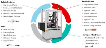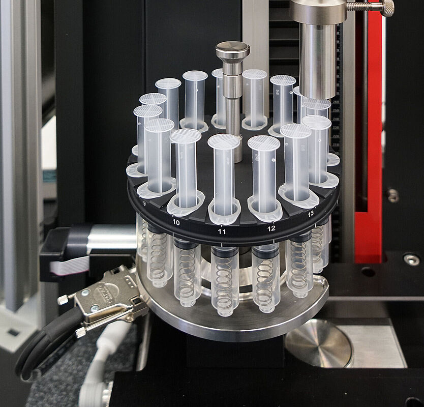 - automatisierte Karusselsysteme zur hochgenauen Bestimmung von Dosiergenauigkeit, Losbrech- und Gleitkraft an Spritzen
