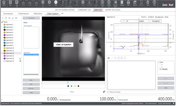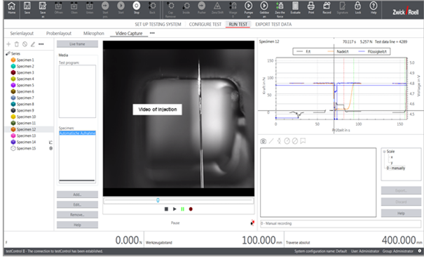ZwickRoell begegnet diesem Praxisproblem mit einer kamerabasierten Vermessung von Injektionszeit, Injektionstiefe und Injektionsverlauf mittels des VDX-Kamerasystems. Die Messung erfolgt berührungslos und unabhängig vom Injektionsstrahl – die Kamera ist bewusst in sicherer Distanz positioniert, sodass Sprühnebel oder Tropfenbildung die Messergebnisse nicht beeinflussen.