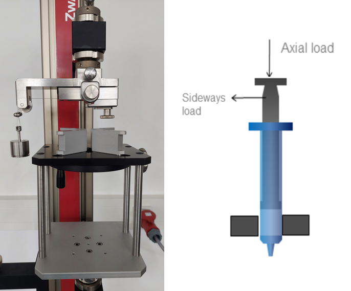 Die Leckageprüfung nach ISO 7886-1 Annex D untersucht, ob eine Spritze auch unter seitlicher Belastung des Stößels dicht bleibt. Im realen Gebrauch wirkt die Kraft selten rein axial – durch Handhabung entstehen zwangsläufig Querkräfte. Die Seitkraftprüfung simuliert daher den kritischsten Dichtheitsfall: Der Stößel wird definiert ausgelenkt, der Stopfen verkantet im Zylinder, die effektive Dichtfläche reduziert sich und es kann ein potenzieller Leckpfad entstehen.