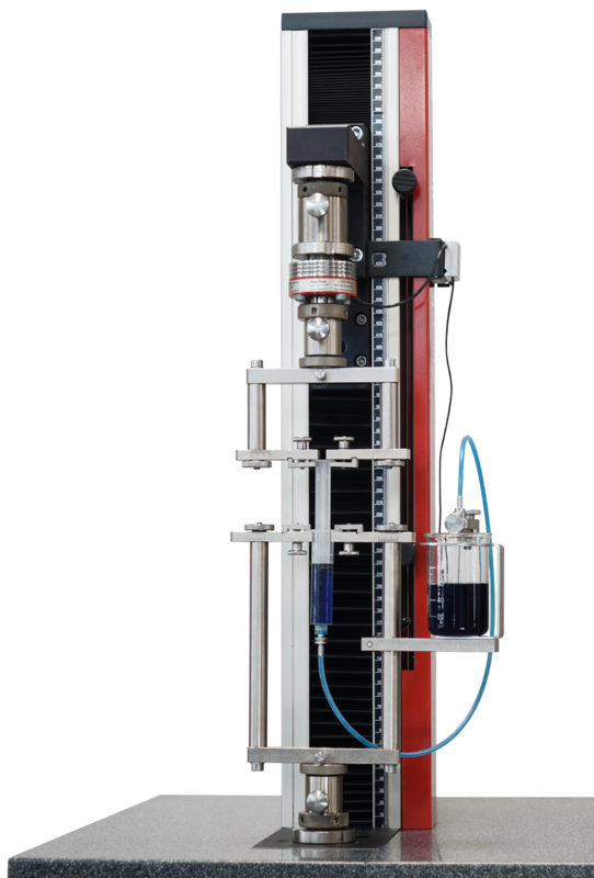 Diese Variante eignet sich insbesondere für Prüfaufgaben, bei denen neben der Druckbelastung auch eine Zugkraft auf den Kolben aufgebracht werden soll. Durch die obere und untere Spannvorrichtung können Spritzen mit Durchmessern von 6 bis 33 mm entsprechend der Norm sicher fixiert werden, während der Prüfaufbau mit Schlauch, Kanüle und Flüssigkeitsbehälter normgerecht integriert wird.