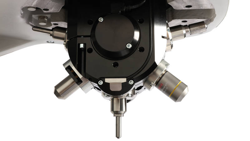 - Die Prüfteile werden entweder direkt auf den Standardprüftisch, in speziellen Prismen-, Plan- oder Kugelprüftischen oder anderen Probevorrichtungen gelegt bzw. verspannt. Bei den vollautomatischen Modellen können auch Probenhalter für gebettete Proben oder Matrizen verwendet werden.
