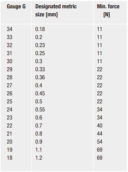 Die Verbindung zwischen Kanülensockel und Kanülenrohr wird mittels Zugprüfung überprüft. Dabei wird die Nadel mit einer definierten Prüfgeschwindigkeit von (50±5) mm/min belastet, bis die in der Norm geforderten Mindestzugkräfte nach ISO 7864 erreicht sind (vgl. Tabelle 1). Ziel ist der Nachweis einer stabilen und dauerhaften Verbindung.