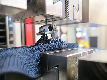 Des essais sont réalisés, sur la base de l’exemple ci-dessus, afin déterminer les caractéristiques du zip en plastique. Pour ce faire, la partie textile de la fermeture à glissière est contrainte de telle manière que le zip puisse reposer comme prévu.