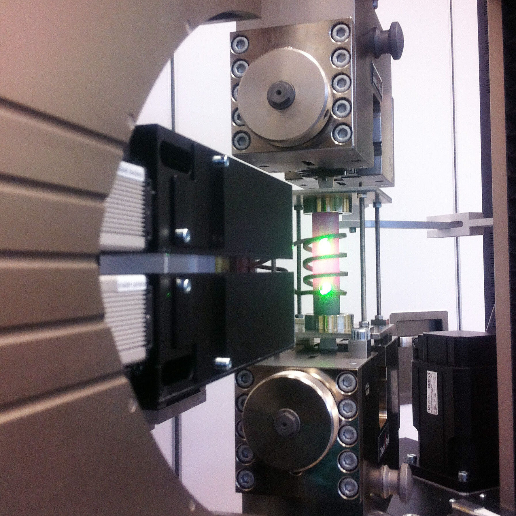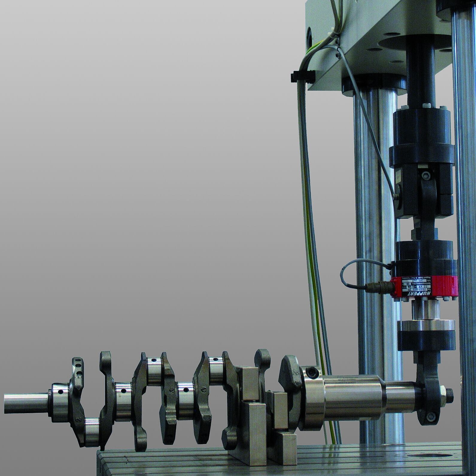 Because of how they are used, camshafts must withstand high, continuous torsional loads. Torsion testing machines can be used for production-related quality control. The torque acting on a camshaft at which component connections begin to loosen is determined. Camshaft sections are gripped horizontally in the machine and a torque load of up to 1000 Nm is increasingly applied. Especially interesting is the elastic and plastic deformation of the camshaft components. ZwickRoell's optical laser extensometer measures the rotational angle without making contact.