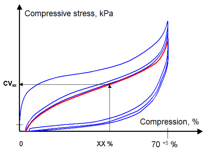 - compression stress-strain characteristics Ccxx for any required percentage deformation in kilopascals: Cxx = 1,000 * Fxx/A