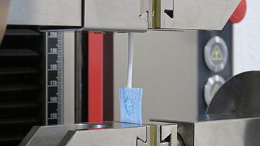 I punti di collegamento tra i lacci e il corpo della maschera sono decisivi per un utilizzo affidabile e confortevole soprattutto per un periodo di tempo prolungato. Con una prova di trazione secondo la normativa ASTM D5034 è possibile determinare la forza di trazione assiale.