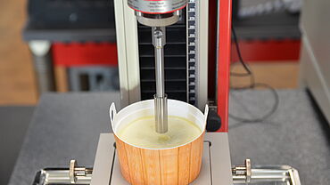 In order to achieve customer-relevant quality criteria right from the development phase, a ZwickRoell zwickiLine universal testing machine is used. It is important to determine which test specimens will be used and which parameters, e.g. indentation depth or speed, will be selected for measurement. Through custom training, employees from various Hochland locations worked with ZwickRoell on different testing possibilities for the determination of firmness and spreadability of various cream cheeses. Important influencing factors include particle sizes in the test material, different types of container shapes, the use of various test tools and the informative value of the curve progressions determined in the process.